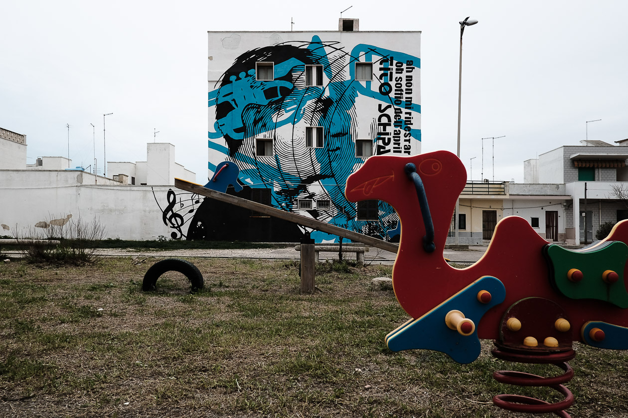 Sotto il profilo formale trovo che l'uso del colore sia fondamentale e funzionale. I colori permettono di evidenziare il contrasto tra i due elementi che catalizzano principalmente l'attenzione, la giostrina ed il cartellone. Contrasto con il bianco dell'architettura, se così possiamo chiamarla, urbana, tipico di molte zone delle nostre periferie del sud. Mi ricorda molto alcune zone della Puglia, ma potrebbe essere in tanti altri posti. Anche il verde del prato è funzionale ad evidenziare una incuria e degrado del prato di un luogo che in realtà dovrebbe essere di svago per i bambini. Nel bianco e nero queste dissonanze sarebbe filtrate, probabilmente i soli toni, le forme ed i volumi non sarebbero adeguati in questo caso a riprodurre con altrettanta efficacia quanto l'autore voglia sbattere sul muso immediatamente. Sempre da punto di vista formale potrei banalmente dire che avrebbe dovuto prestare maggior attenzione al taglio della giostrina, perchè secondo le regole comuni appare errato, risultando marginale la porzione residua. O un bel taglio netto, tipo a metà, oppure lo lasciamo intero, o altro ma così proprio no. Ora mi domando se una cosa così banale possa essere trascurata da uno che ha comunque una certa esperienza o se invece non vi sia qualcos'altro dietro. Ed allora posso pensare che in realtà quello che comunemente viene messo in evidenza come distrazione, perchè in primo piano, perchè tagliato male, perchè perchè perchè, etc e non possa essere funzionale o utile nell'economia dell'immagine. Ossia l'autore è su certi aspetti che vuole attirare l'attenzione, e ritiene che una forma scorretta sia funzionale. E' ovviamente possibile che la mia sia una lettura oltre le intenzioni, però può in me far sorgere la domanda se tale cosa possa avere una mia possibilità di utilizzo all'interno della mia visione, e non rovesciare il punto di vista dicendo guarda che la prossima volta taglialo per bene che così non va.