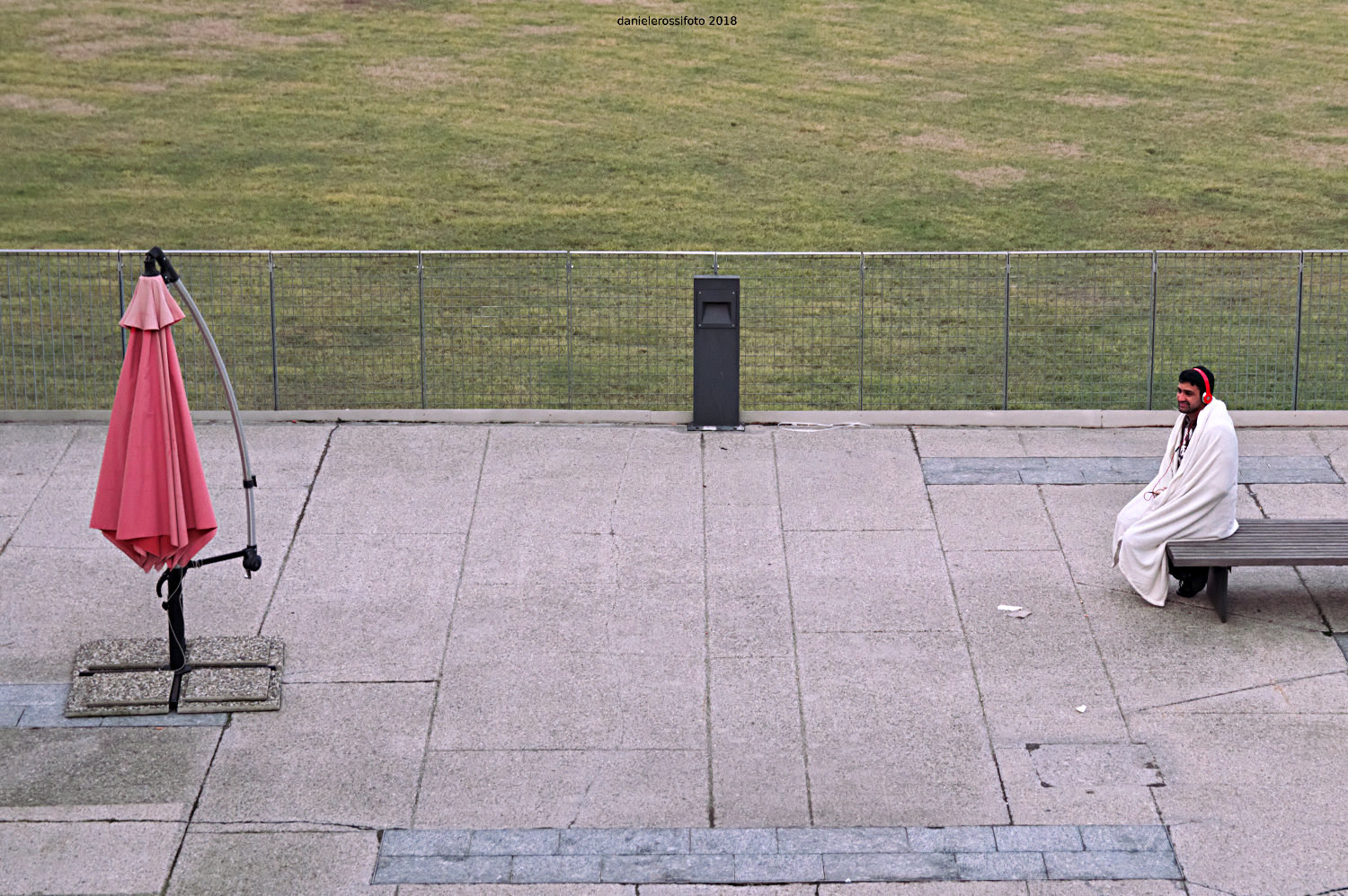 Grazie Claudio è una lettura che mi piace. In effetti ero in giro per fotografare altro quando ho visto questo tipo con la coperta addosso in una zona di uffici, non era orario di lavoro ed era semideserta. Ho notato il colore delle cuffie e quello dell'ombrellone chiuso. Quando si e' seduto ho visualizzato questa disposizione degli elementi e avevo la fortuna di un pdr alto rispetto alla scena.
