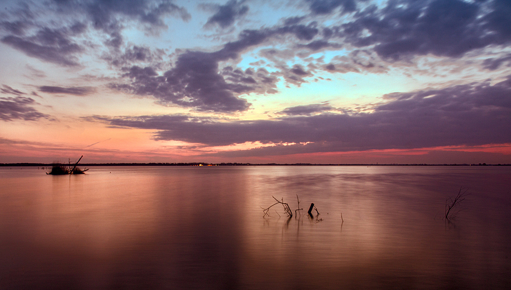 Molto bella Bruno, un cielo ricco di sfumature di colore, fra rosa ed azzurro, e di dinamismo di nuvole, e una parte inferiore che per me è la più affasciannte,con la resa quasi solida, dell'acqua al tramonto, resa densa ,e lucida come mercurio, dal tempo dilatato. Orizzonte centrale, per dare pari dignità visiva a questi due mondi contrapposti.