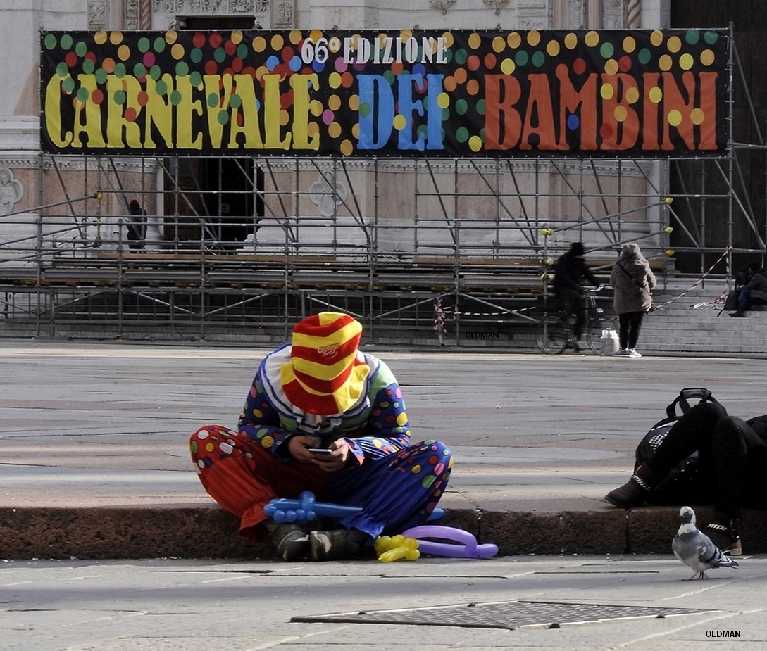 Ciao Oldman, una street non si tocca ...ma quanto mi sarebbe piaciuta senza le persone dietro! un tripudio di pois e colore per un carnevale finito o che deve iniziare (ma propendo per la prima) in cui il clown tecnologico risponde a messaggi arretrati Il fuoco cade alto ..ma è una street! anche se ,a mio parere eh, anche le street dovrebbero essere complete...