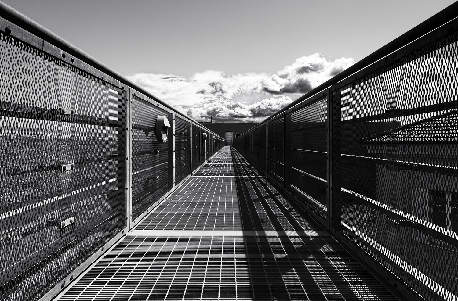 Un allungo vertiginoso e quasi senza termine. La piccola porticina a fondo corsa però stabilizza il percorso. Lo sguardo corre in avanti e prende velocità, pronto a decolare verso quei soffici cuscini di nuvole. Il bianco e nero enfatizza con efficacia il contrasto fra il duro rigore delle linee e la morbidezza della parte riservata al cielo. Molto bella.