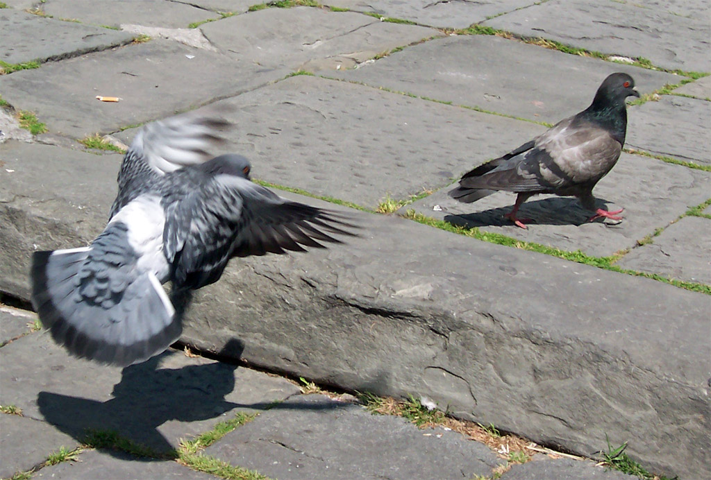 Il momento colto è spiritoso, ma il piccione che sta posandosi a terra è un po' troppo sfuocato, e anche quello che cammina non è nitidissimo.
