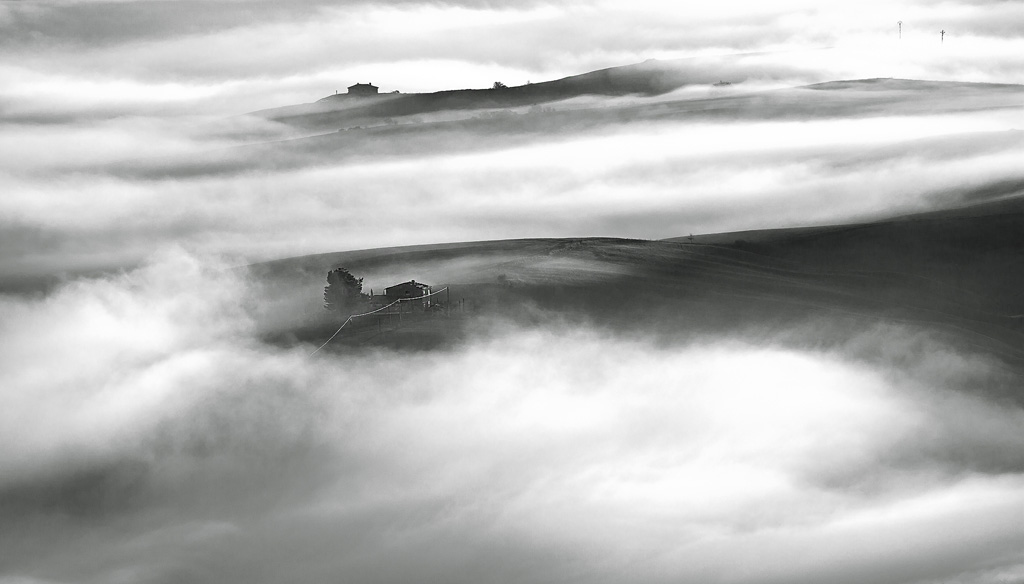 Veramente bella. Questi piani che emergono dal bianco, che si composta come un colore, denso e mobile, che addirittura aggiunge, nel suo avvolgere stretto i casali ,qualcosa di potente di fisico. Un amre simbolico. Quel poco che emerge, in nero, dalle nubi, tralicci sotili o cavi sottili, è un gallegigare netto e reso con precisione, e armonicamente nel punto giusto del quadro .