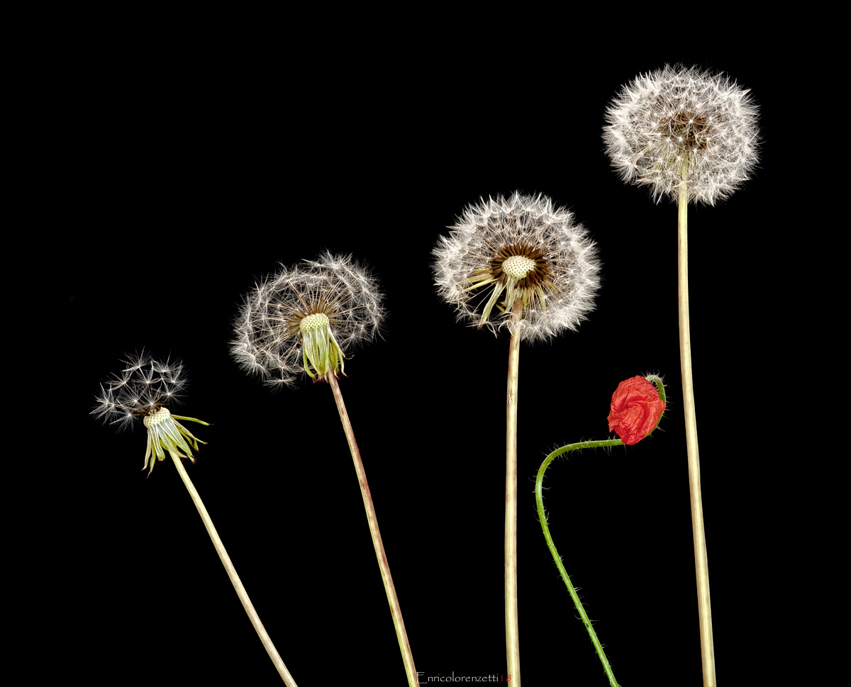 bellissima composizione con i soffioni in scala che emergono dal buio e il papavero invadente si inserisce e regala un tocco di colore. Mi piace molto