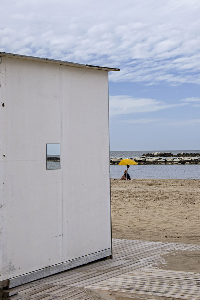 | La foto mi attira per la delicatezza dei colori ma quello che trovo più intrigante è il riflesso nello specchio appeso. Tanto per fare conversazione , esortato da nfeddu, e chiaramente dal mio punto di vista...,cercherei di valorizzare al massimo la sua presenza prendendo in considerazione anche un formato quadrato, tenendo dentro solo la parete bianca della cabina , la spiaggia e l'azzurro del cielo e mare. Un saluto, Guido.