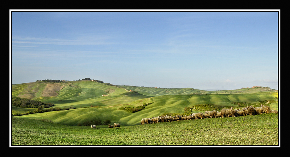 Cornice bianca e nera, importante, che forse appensatisce un po' una scena bucolica che già è rinforzata, come peso specifico ,da tinte di forte impatto. Ma la premessa è tutta mia ,una personale sensazione , e la fot è molto molto piacevole, ariosa, panoramica e allegra nelle tonalità, tanto da sposare con armonia, una visione bucolica che avrebbe qualcosa di antico, ad una paesaggistica più ariosa e moderna.