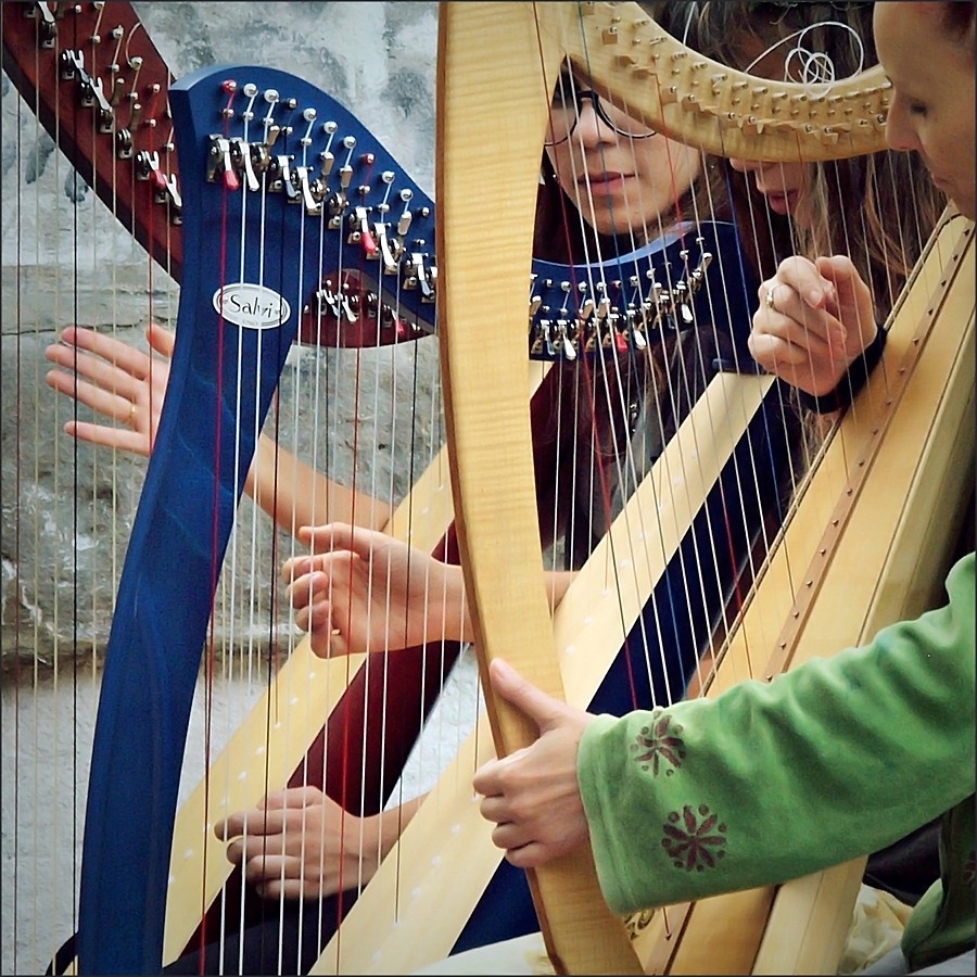 Bello il susseguirsi di corde e di mani , lo trovo l'elemento principale della foto . Non so se anche tu lo hai considerato come ipotesi ,ma proverei a tagliare in alto all'altezza del mento più basso dell'arpista a destra ,proprio per entrare di più nel dettaglio mani -corde.Mi piace. Un saluto, Guido.