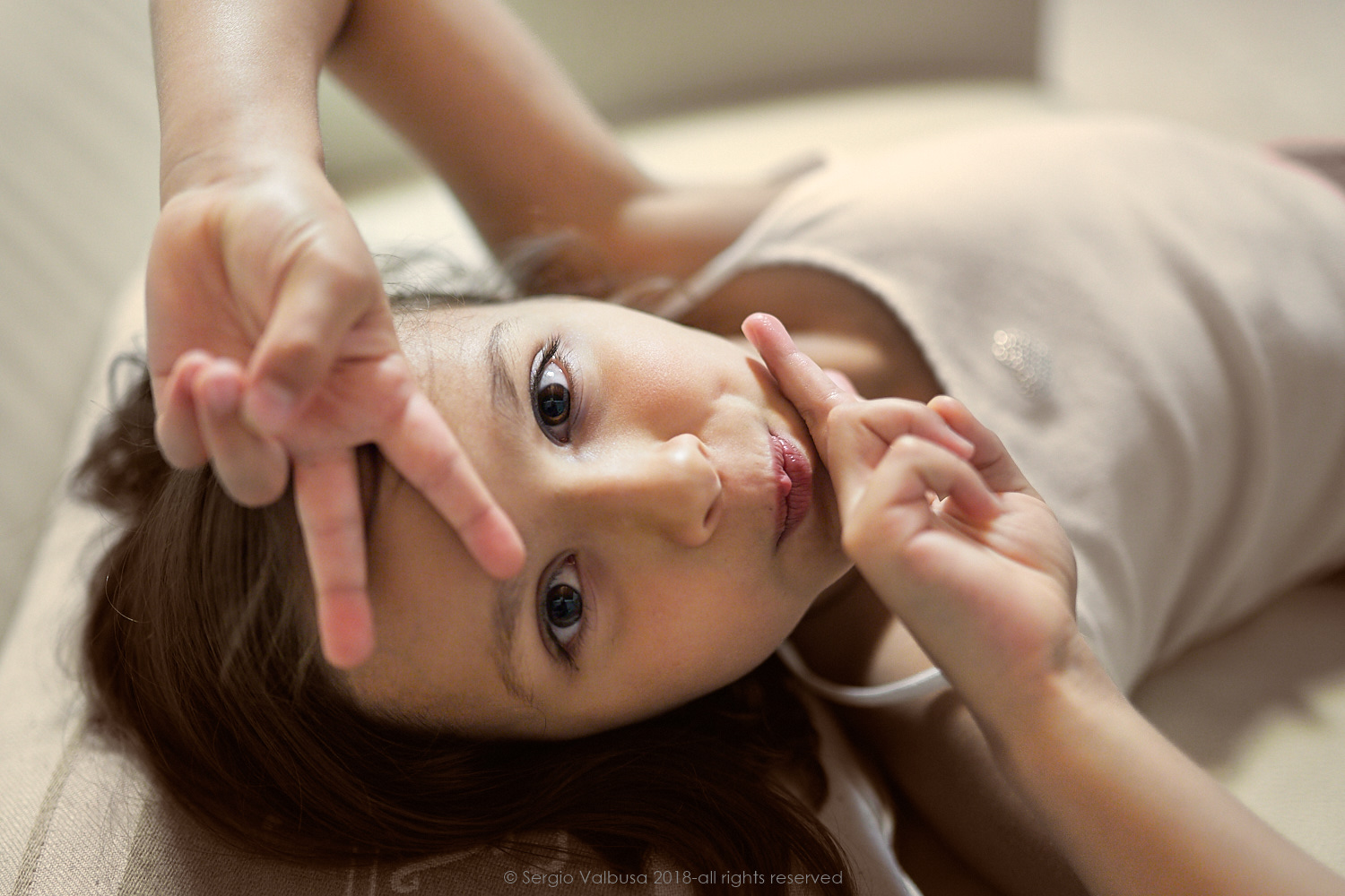 Mi piace la spontaneità dei ritratti della tua bimba, sempre allegri e complici,oltre che appunto,molto naturali. Efficace il bagno di luce che la investe,accarezzandole il viso, molto buona la gestione dell'incarnato. La mano sulla fronte,così fuori fuoco, un poco ruba l'attenzione, però ci si può passar sopra, lo sguardo arriva,forte e diretto. Ciao