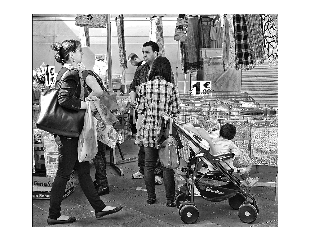 Bello scorcio di quotidianita'. Anche a me pare di vedere una nitidezza un po' spinta, in particolare sul contorno del viso del commerciante e sull'abito a scacchi