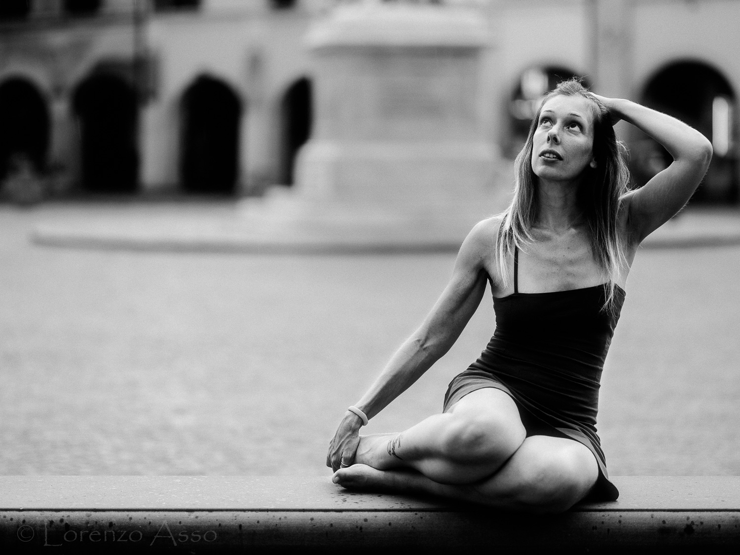 Ciao, la bella posa della modella e la dinamicità del gesto donano un quid ad un'immagine che forse un semplice sguardo in macchina non avrebbe dato. Il b/n e il forte sfocato sono indicati nel mettere in evidenza il gesto e il corpo della ragazza. Un'immagine di sicuro fascino. Sasà