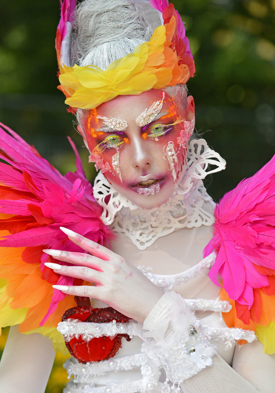 Una fantastica esplosione di colori, arricchita pure da uno sguardo a tratti inquietante e intrigante. Mi sarebbe piaciuto un sacco vederla più larga,per la curiosità di vedere il costume per intero,ma il taglio è efficace. Ottimo anche il modo in cui emerge dallo sfondo dal piacevolissimo sfocato.Bella proposta