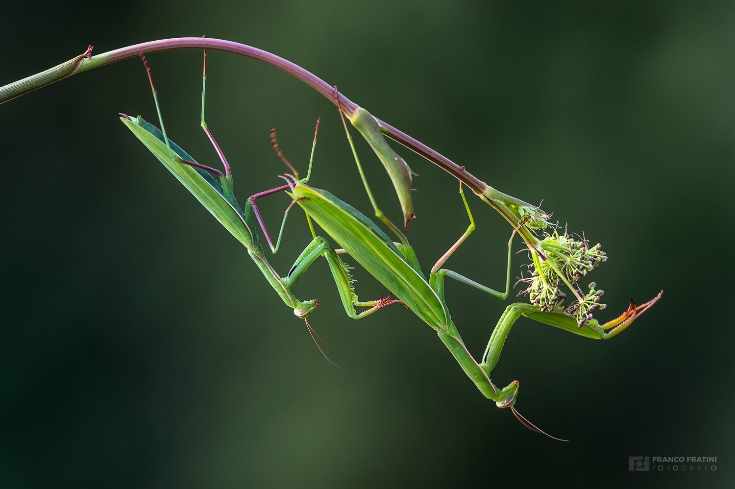 Bel documento. Le due mantis ben illuminate si "staccano" bene dallo sfondo scuro.