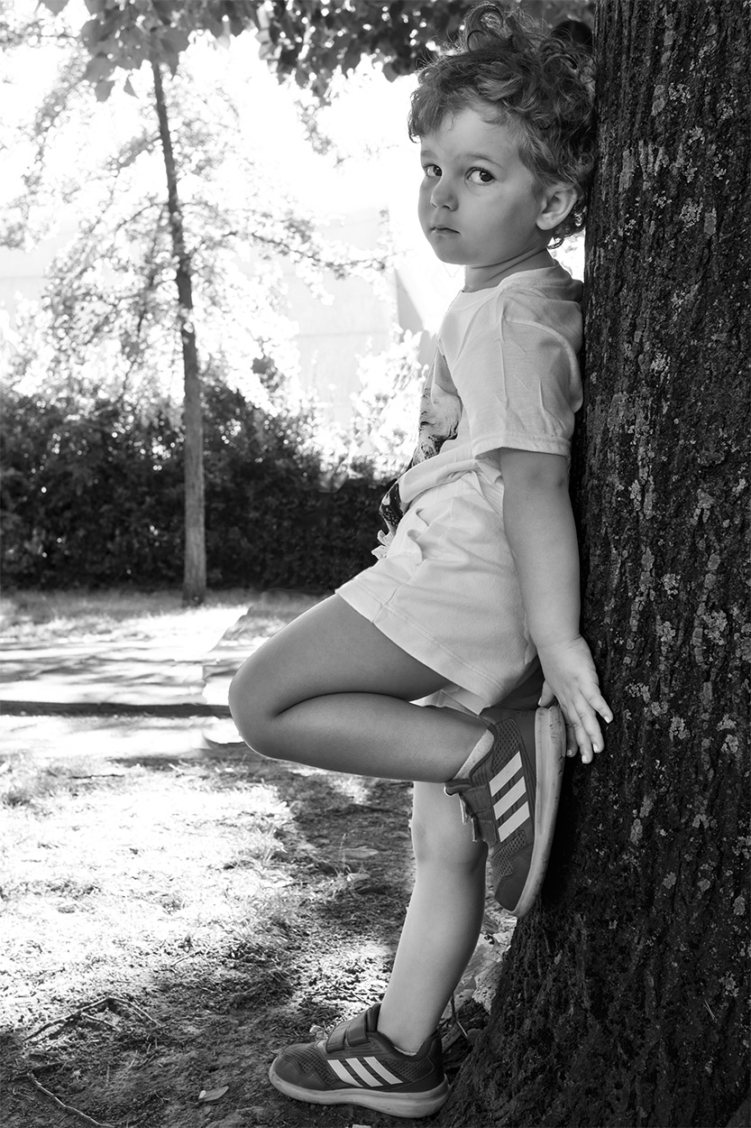 L'espressione del bambino mi piace un sacco e anche la posa con questo albero in appoggio la trovo congeniale. Anche il B/N è equilibrato. Vicino al ginocchio io vedo un alone strano, come di una clonatura. Avrei poi tentato di abbassare un po' la luminosità dello sfondo. Comunque, la spontaneità dello scatto fanno passare in secondo piano questi due piccoli dettagli.