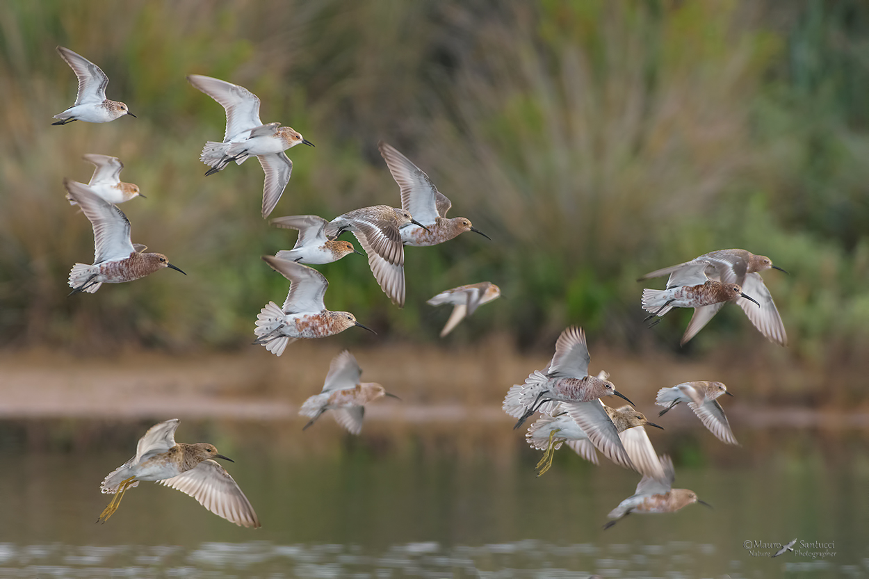 Stormo di limicoli, si possono riconoscere combattenti, piovanello comune e gambecchio