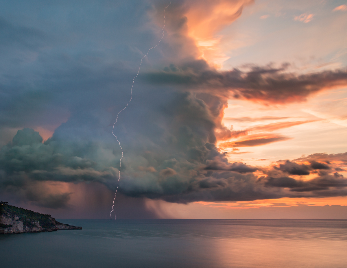 Wow, magnifica, momento colto davvero ottimo, bellissima la fusione tra toni freddi del temporale in arrivo e i toni caldi del tramonto e poi il fulmine che taglia in due l'enorme nuvolone temporalesco una vera chicca.