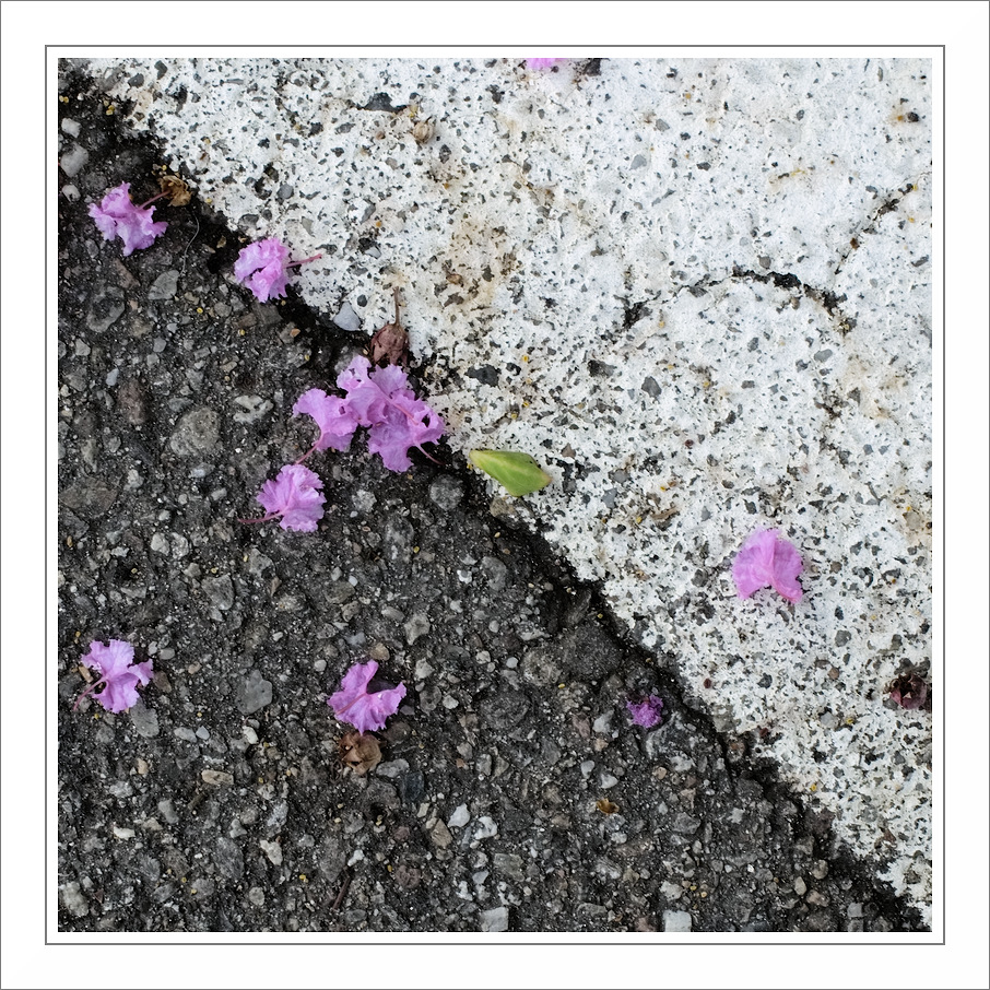 Il taglio quadrato “prediletto” ,l’essenziale traccia della materia ruvida e statica abbinata alla morbida consistenza dei fiori, il bn interrotto dal colore mi fanno preferire questo scatto. Avrei solo fatto in modo che le due parti del frame fossero perfettamente uguali ( ma forse lo sono ed è una mia illusione ottica).