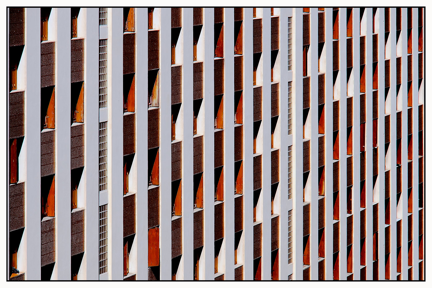 Ipnotica composizione architettonica, molto interessante l'alternanza di bianco e rosso. Linee curate, ruvida il giusto nonostante la luce dura. Qualche leggero residuo di aberrazione cromatica sulle linee ad alto contrasto.
