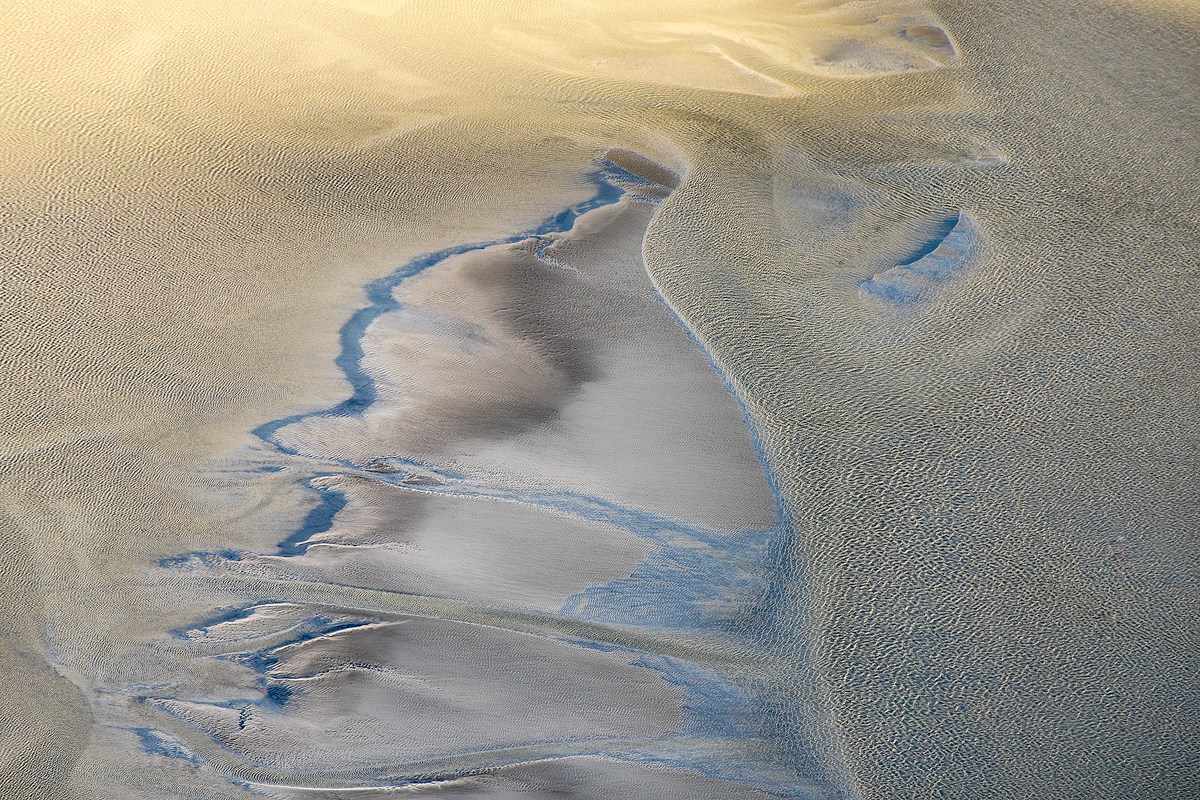 Sinuose curve di blu che si perdono,si amalgamano con questo mare dorato e poi si riprendono la loro identità . Disegni dalle sfumature preziose,superfici che non si definiscono,non si delimitano mai in maniera netta ma si fanno l'una il prosieguo dell'altra. Sensazioni che si fanno colore,natura che sfoggia la sua arte e una personale,sensibile interpretazione che ce la racconta.