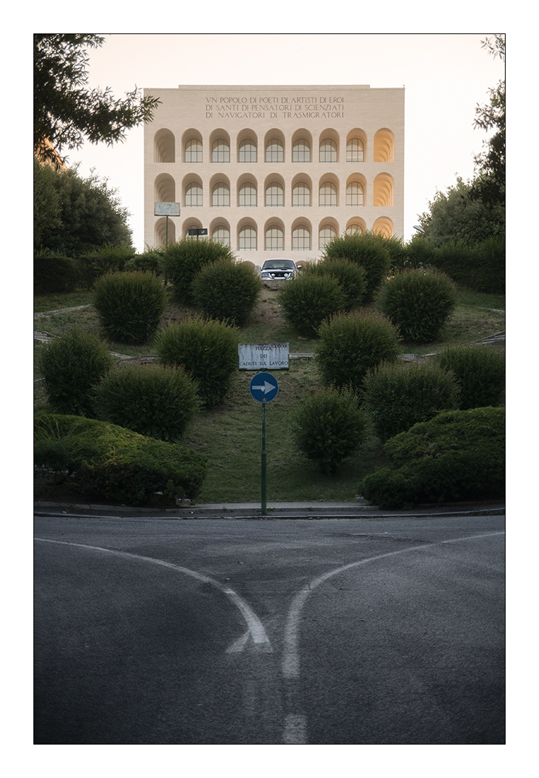 Non è una ripresa descrittiva, a mio parere, altrimenti potrebbe apprezzarla a pieno, forse solo chi è in grado, conoscendo il luogo, di valutare l'impatto della foto , a confronto con la realtà fotografata, in fedeltà di luce , di forme, di contesto. Qui ci vedo una marcia diversa, una emozione nascosta fra le forme architettoniche, che vengono inserite in modo preciso nella composizione. a una emozione sapientemente contenuta, come preservata, elargita con parsimonia. Io visitai l'Eur secoli fa, ne ho un ricordo turistico, veloce, distratto. Per cui la guardo con occhio nuovo, che cerca abbracciare un insieme di parametri al di là del soggetto specifico. Mi colpiscono le arcate multiple che sembrano guardare noi dall'alto e no viceversa e il loro stile austero si stempera dolcemente in una nota di cielo pastello, e con una bagno di colore dorato che invade la parte destra delle arcate e scalda la scena. Anche i fari del fuoristrada, che mille autori avrebbero fatto sparire, entra nel gioco, ci scruta a sua volta, come fa la prosaicità del quotidiano che si mescola a più nobili soggetti. E la alta verticale compositiva confeziona tutto questo nella precisione di una base estesa di asfalto , di segnaletica centrata e quasi un po' straniante, di aiuole educate, tondeggianti nella siepi, ben composte. C'è dolcezza ma c'è anche distanza: bellezza celata fra le cose più banali... tutta da scoprire. Giustamente un paesaggio interpretato, e non fredda architettura.