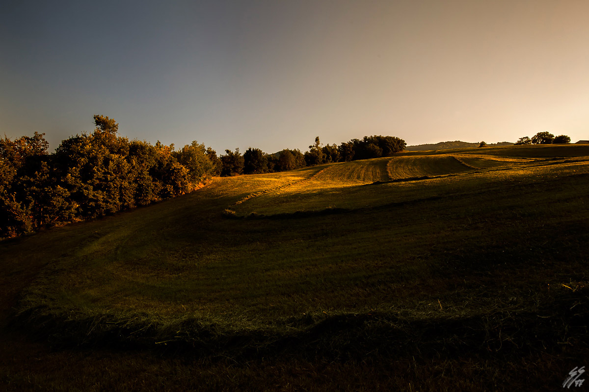 So che rinunciare al cielo sarebbe troppo, ma la metà inferiore, con l'ampia curva in penombra da cui emergono i solchi dell'aratura e il verde appena accennato dell'erba, è così bella e compiuta in sé da poter anche farne a meno.