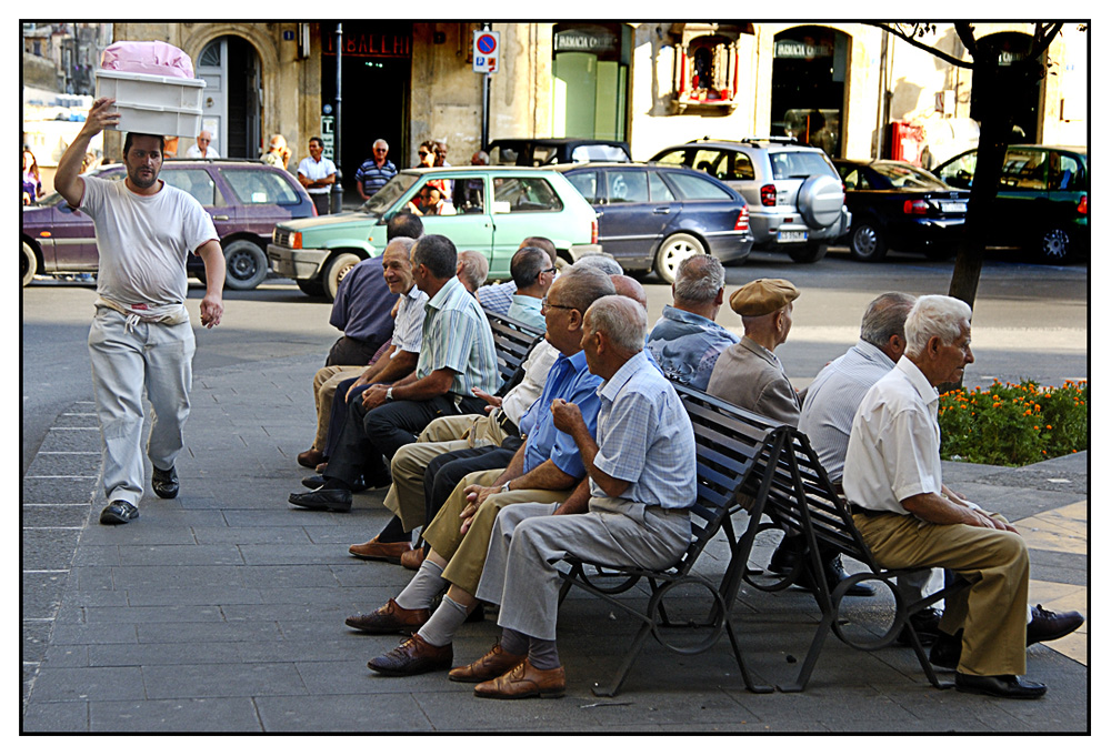 Bella ripresa.. e ben gestita..con tanti bei pensionati a parlare mentre osservano il passante intento nel suo lavoro..