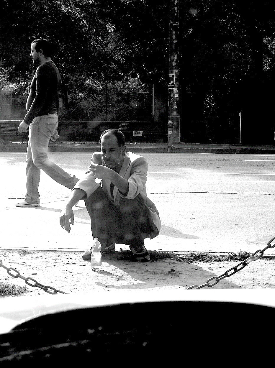 Trovo migliore la foto che hai cancellato nei giorni scorsi: lì l'uomo accovacciato si inseriva nell'arco della ruota di un pullman...qui invece c'è la sovrapposizione col passante che personalmente trovo fastidiosa in termini estetici...un click prima o un click dopo può fare la differenza...