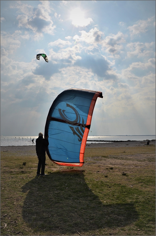 Mi piace questo scatto,qui abbiamo un pò di tutto,L'uomo che regge l'aquilone creando un ombra..cielo luminoso che si affaccia tra le nuvole alcuni raggi di sole.ottima composizione. Ok! Ciao Buona serata.