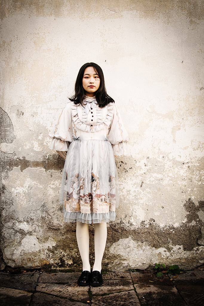 Colpisce il contrasto tra il lezioso vestitino e la posa rigida seppur partecipata della ragazza, ma pure con l'ambientazione degradata che ne diviene perfetto palcoscenico.