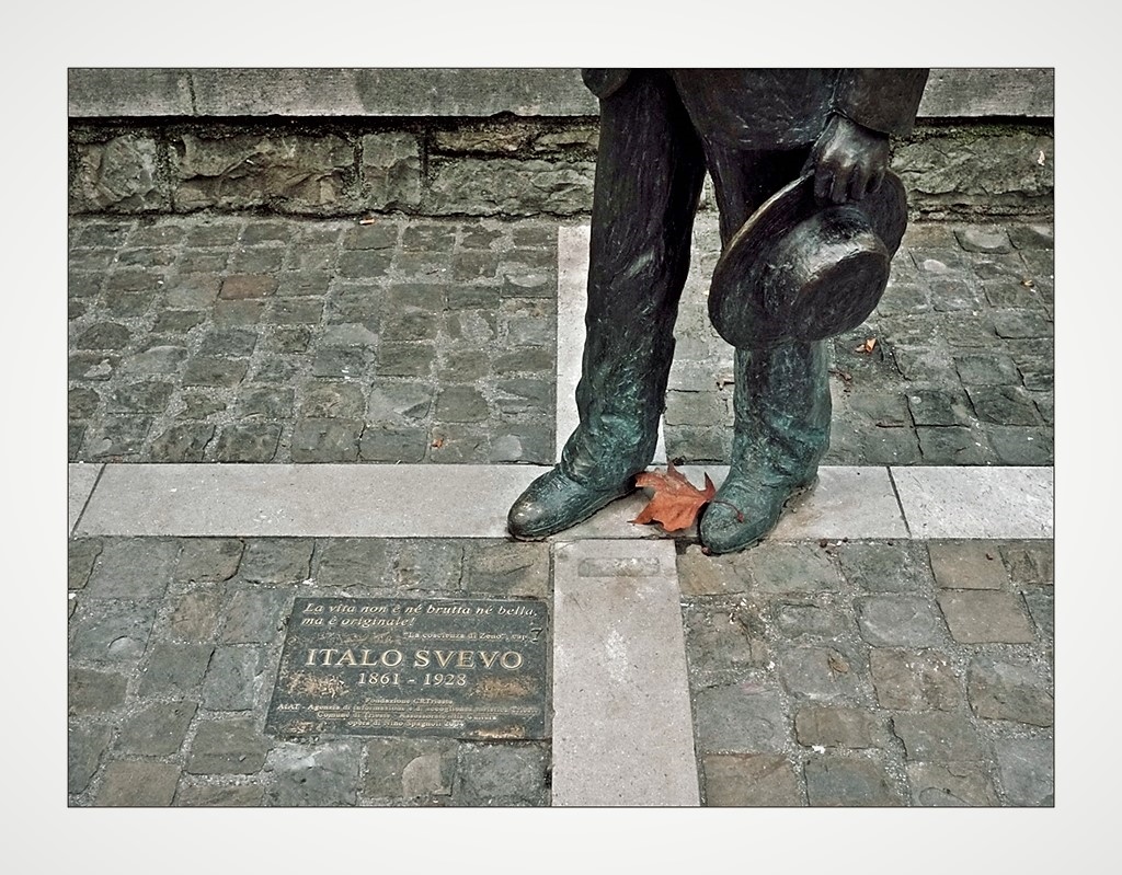 Una foglia, un tocco di colore quasi vivido che ben si addice alla bronzea statua dello scrittore.