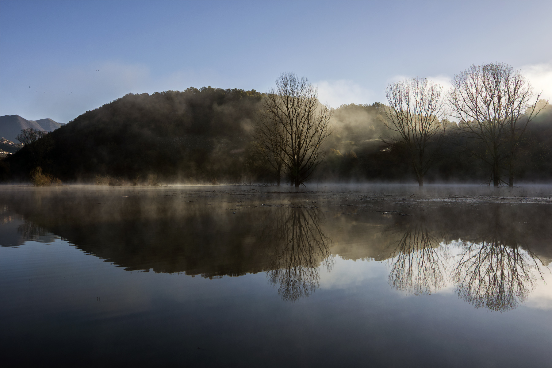 Immagine d'atmosfera dove il bel riflesso è accarezzata dalla leggera foschia sospesa a pelo d'acqua.