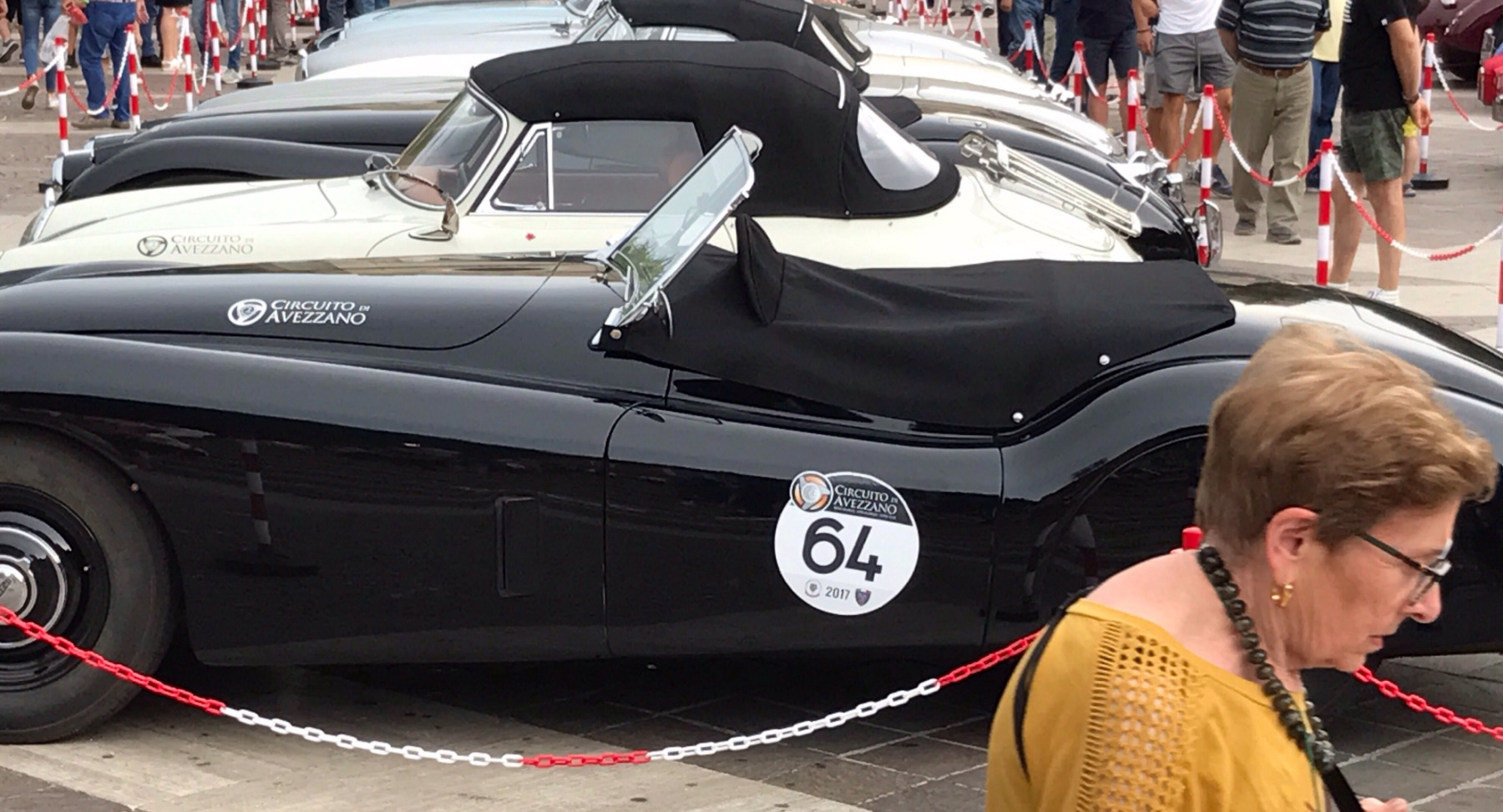 Perdonami Riccardo, ma questo taglio secco su tutti i lati non mi permette di isolare la chiave di lettura della foto. Come si lega la presenza ingombrante (sia in termini di spazio che di colore) della signora in primo piano con le auto d'epoca e le catene bianco-rosse?