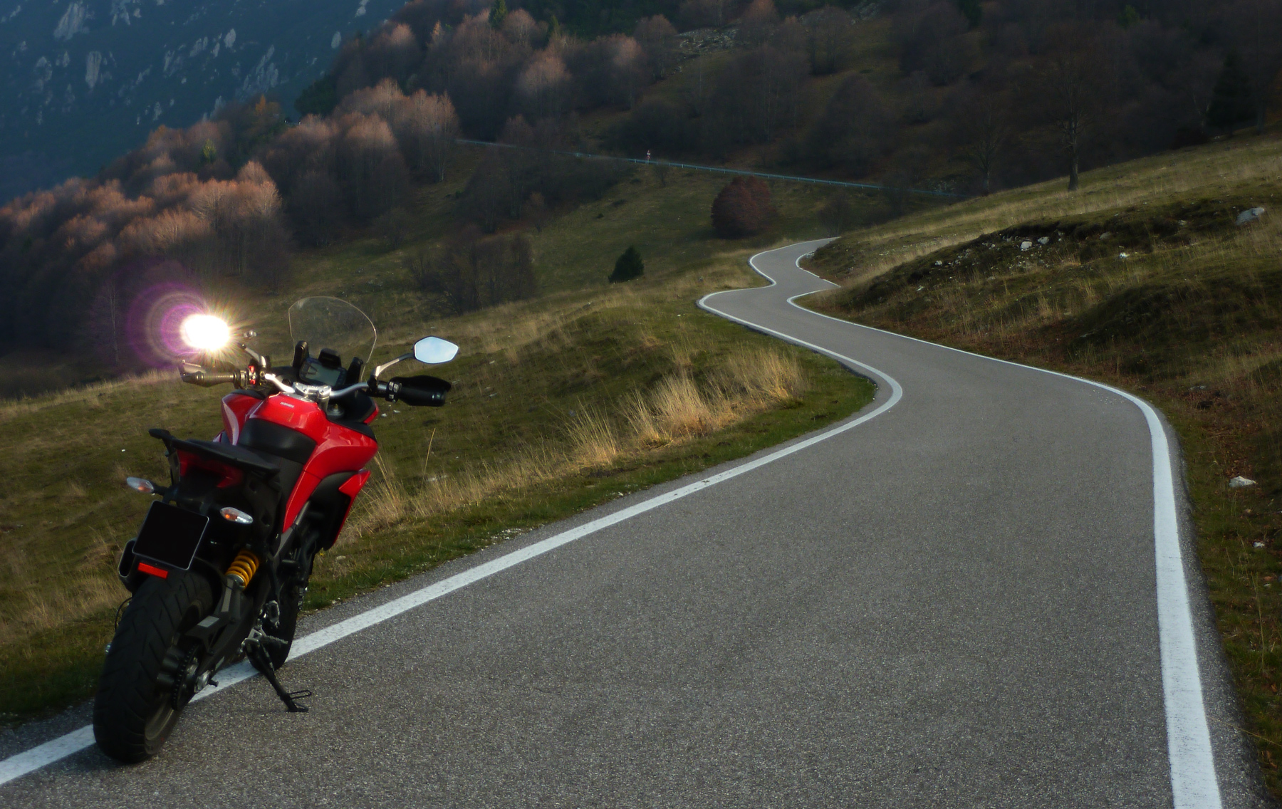 Bellissimo scorcio di paesaggio, e strade invitanti per la Multistrada 950...ma la vedo invertita come un riflesso allo specchio.