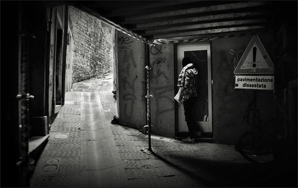 Qui di dissestato non è solo la pavimentazione ma la sensazione è quella di un luogo degradato. Impalcatura, scritte sui muri, etc. Quartieri marginali di solito abitati da immigrati e persone disagiate. Il cartello di pericolo generico veicola perfettamente questa condizione ed è stato giustamento valorizzato nella perfetta composizione, la via di fuga a sx che dona profondità.