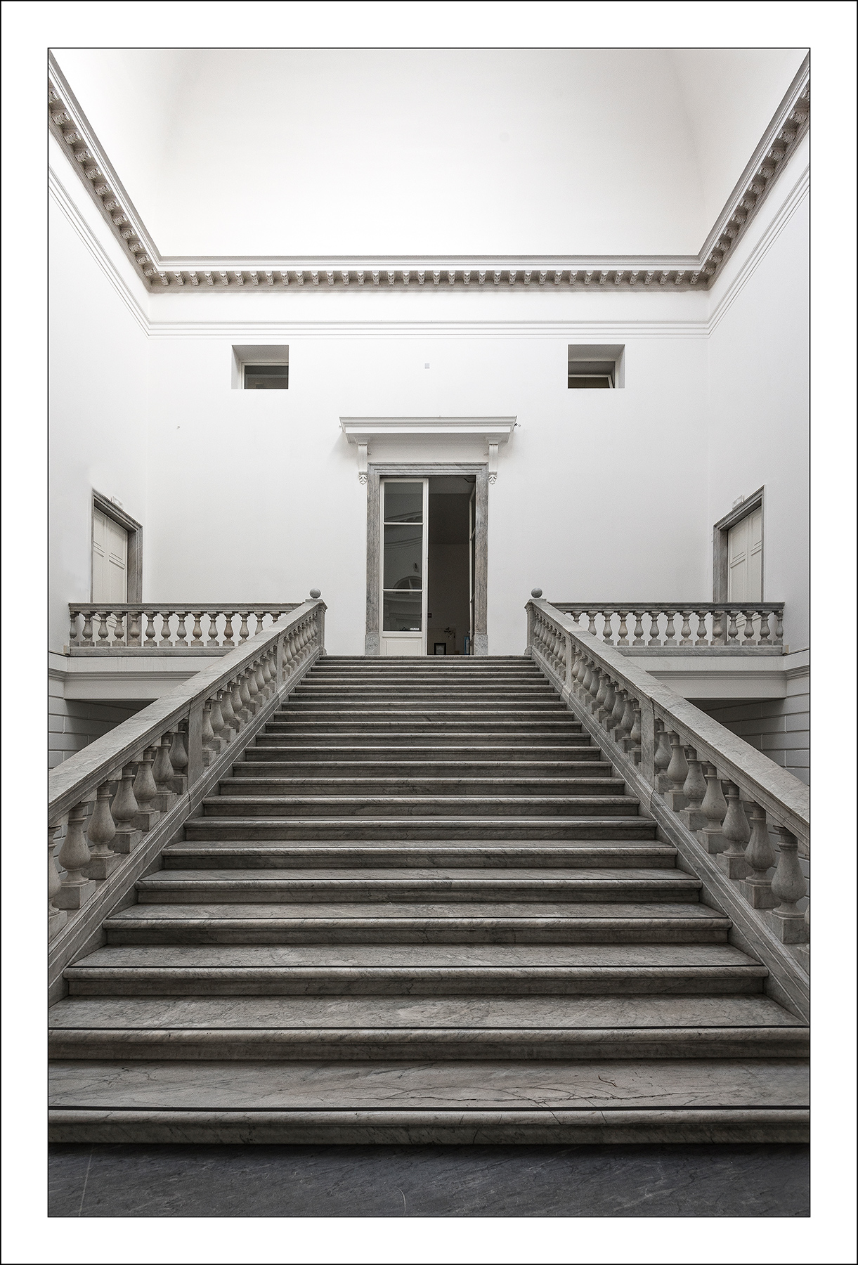 Un luogo asettico dici ma non mi stupisce affatto che lo abbia reso ,al contrario, suggestivo anche per merito dell'inganno visivo. E poi c'è la a colpire l'occhio ed i triangoli che si vanno a formare ( e i due 7 speculari mi piacciono molto !) nella composizione per arrivare in cima allo scalone nel vertice sull'architrave. Forse non è precisa come avresti desiderato ma un ottimo compromesso tra 'base e altezza' tanto per restare nell'amatissima geometria