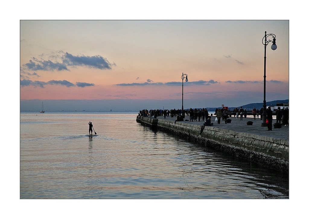 Ottima composizione e ripresa di tantissime persone sulla passeggiata del molo, e lui solo sulla tavola a remare..Piacevoli colori del tramonto..Buona giornata. Ciao