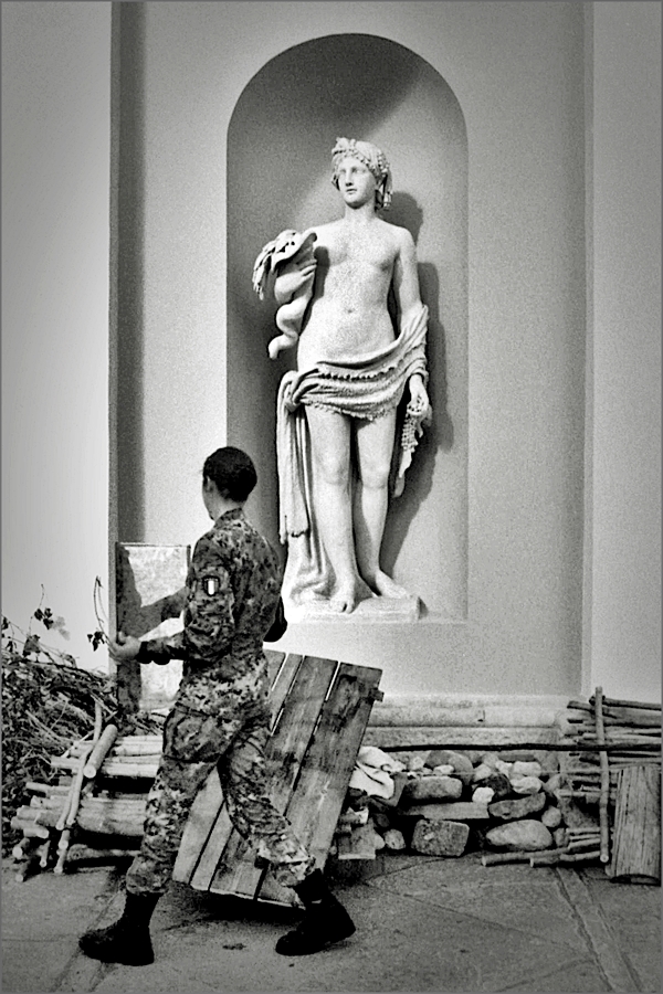 Grazie Franco,i militari stavano allestendo una installazione in occasione della commemorazione dei cento anni dalla fine della prima guerra mondiale.Avrei dovuto scattare con il soggetto in entrata nel terzo di destra ma un passante mi ha fatto ritardare di un secondo.La foto risulta quindi unpo' sbilanciata a sinistra ma ho voluto ugualmente proporla.Per riequilibrarla,mantenendo le proporzioni del frame,avrei dovuto stringere a destra e di conseguenza anche in alto ma non volevo perdere la curva della nicchia.Al momento dello scatto non potevo inquadrare oltre a sinistra per la presenza di persone. Ciao  _________________ Sergio Demitri https://www.flickr.com/photos/124946035@N02/