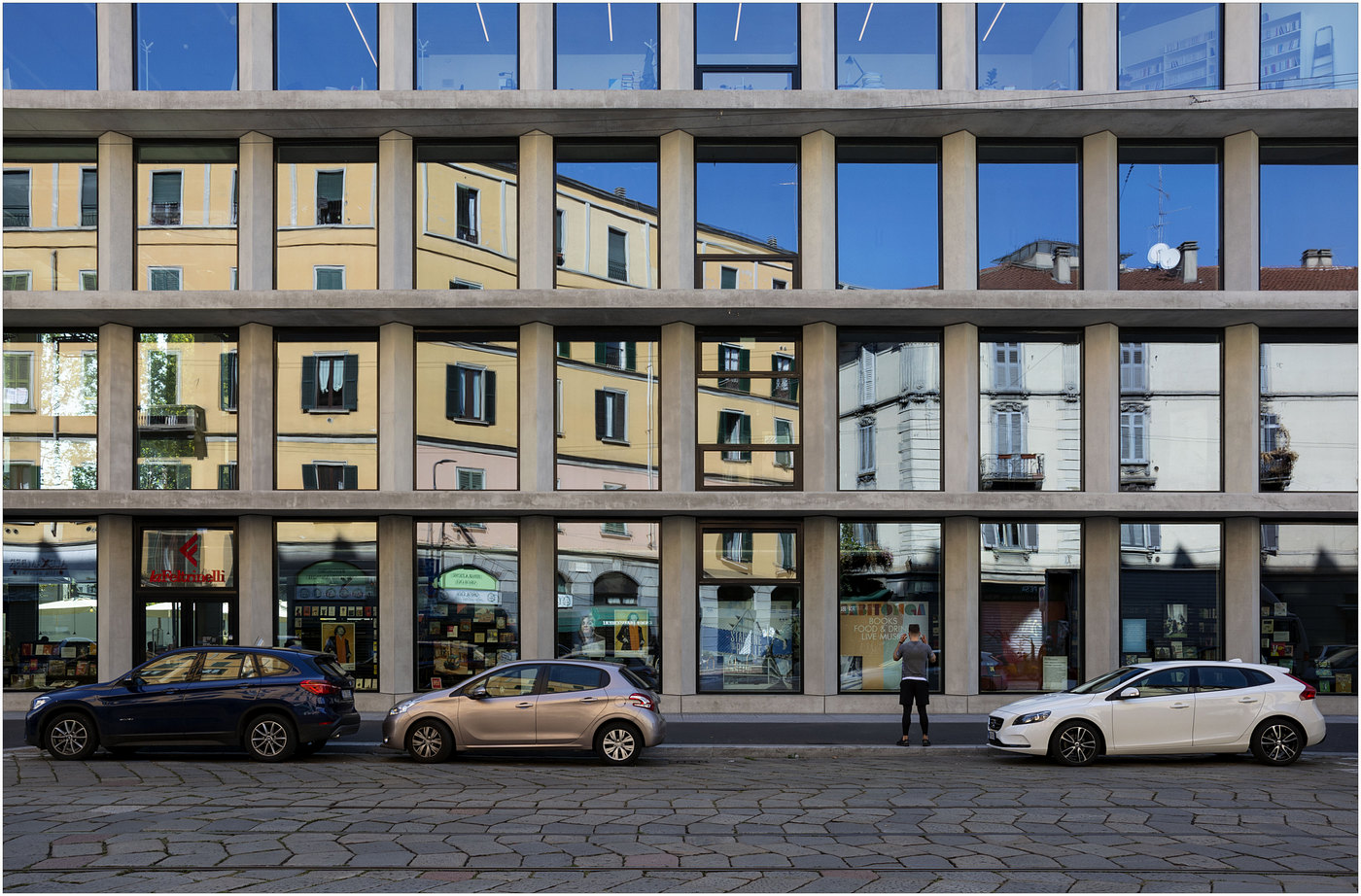 Bellissimo il paesaggio urbano riflesso nella parete specchiata dell'edificio, ma per me il vero soggetto e punto di interesse è la persona presente.