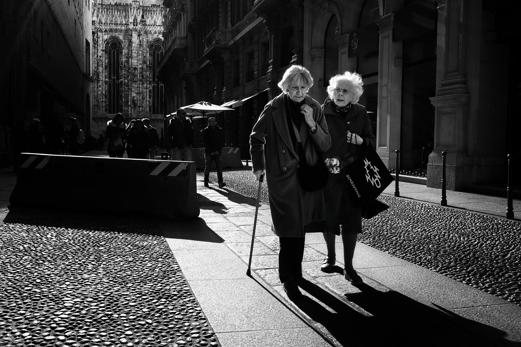 una bellissima immagine con la luce che illumina e riscalda le due anziane signore a passeggio, b/n e nitidezza come sempre da manuale