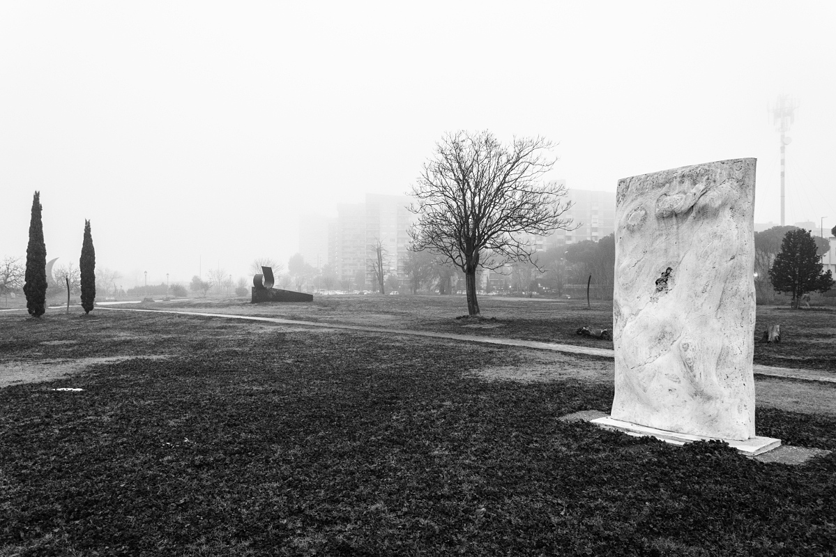 Il parco di Villa De Sanctis sulla Casilina, trasfigurato e travestito in abito padano con la nebbia.