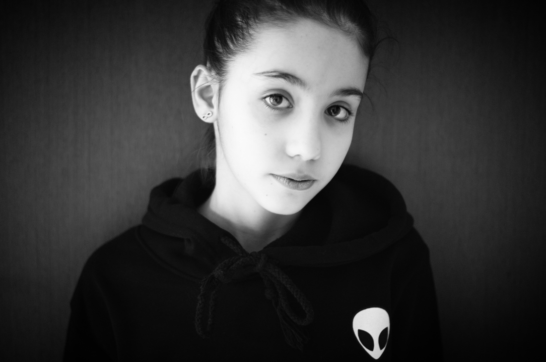 Bello vedere che c'e ancora voglia di dire la propria, sia emotivamente che tecniacmente in merito alle fotografie condivise. E con piacere ho mostrato questo scatto che ritrae mia figlia minore. Lei era molto felice di farsi ritrarre con la sua felpetta nuova, quindi non avrei mai escluso lo stemma dalla inquadratura..... è piccola, ma pur sempre donna, quindi consigliabile assecondarla. Ho scelto, essendo a casa, un fondale neutro ma scuro che mettesse in contrasto il colore chiaro del viso per creare un parallelismo tra il piccolo alieno sulla maglia ed Ilaria. ... che molto spesso, essendo in piena crescita, è aliena a me per primo.