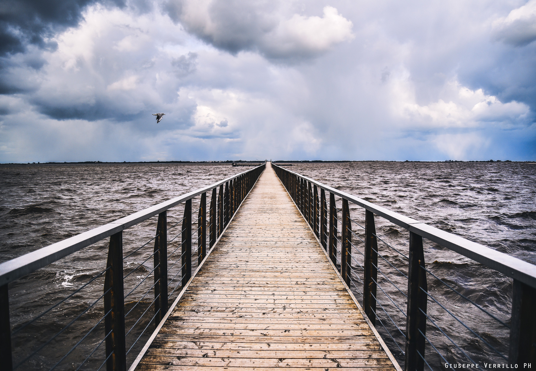 Immagine potente, si viene catturati dal triangolo del pontile che letteralmente ci catapunta verso la linea dell'orizzonte. Il cielo completamente coperto di fitte e corpose nubi ed il mare scuro ed increspato donano grande forza all'immagine. Il volo solitario del gabbiano è il tocco in più per questa ottima proposta.