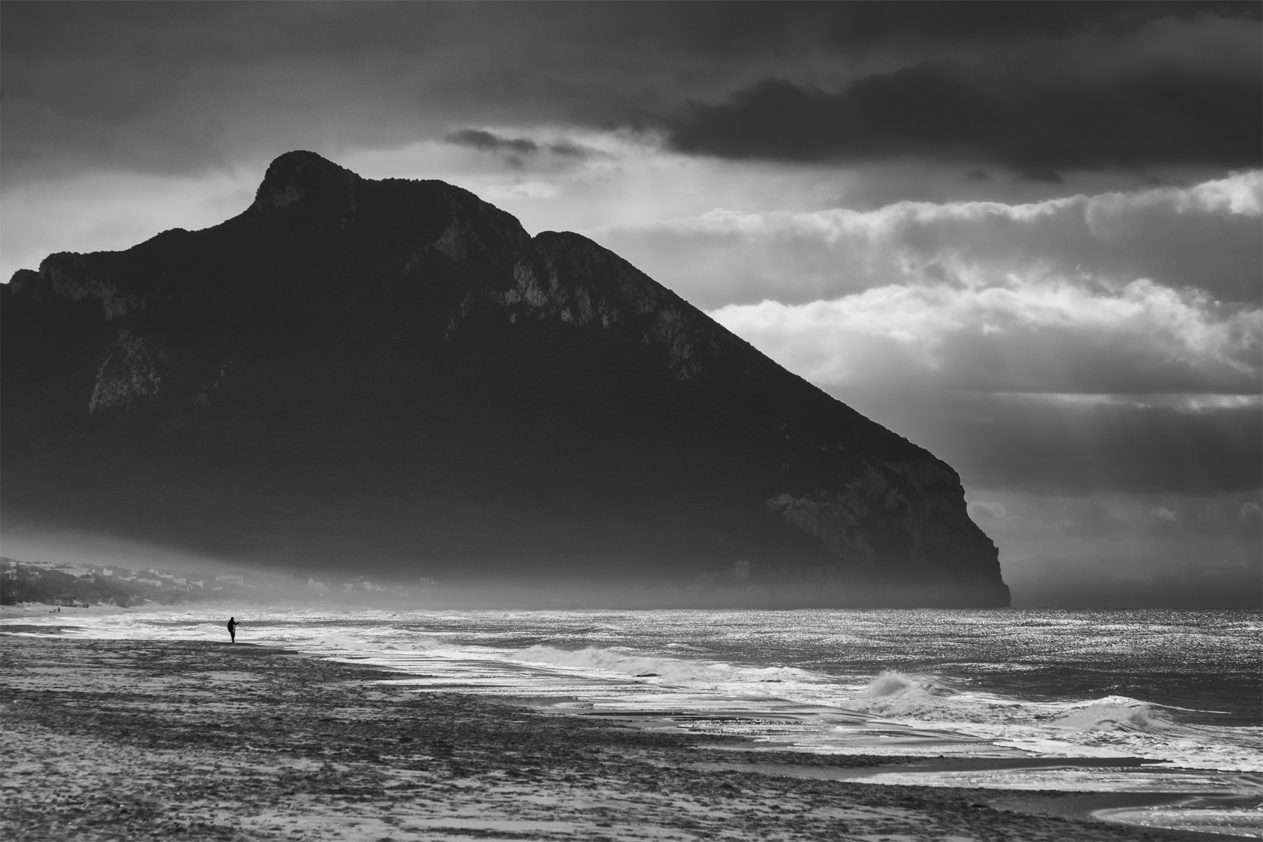Mi piace molto questa foto, il piccolo uomo sulla spiaggia, sotto la maestosità del monte e la grandezza del mare è il fulcro di attenzione e arricchisce il bel paesaggio, il tutto condito con un ottimo BN...limerei solo la mdc sul profilo del monte...complimenti