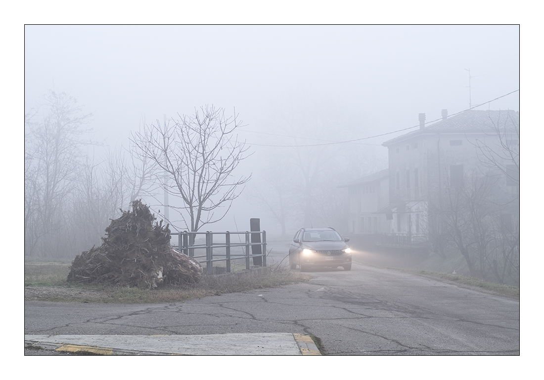 Un bellissimo reportage dove la nebbia è protagonista.Un paesaggio che si svela e si cela con una sola presenza data dall'auto che avanza lenta e silenziosa a fari accesi.Tonalità ed inquadrature ottime;ma su questo non c'era da avere dubbi.Complimenti! Ciao,Sergio. Smile