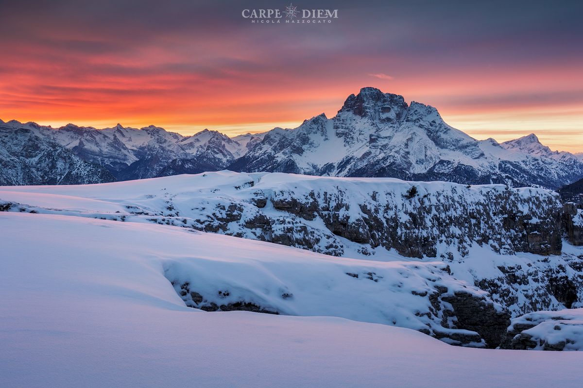 dietro la Croda un tramonto infuocato che tinge di un rosa delicato anche la neve in primo piano, bella