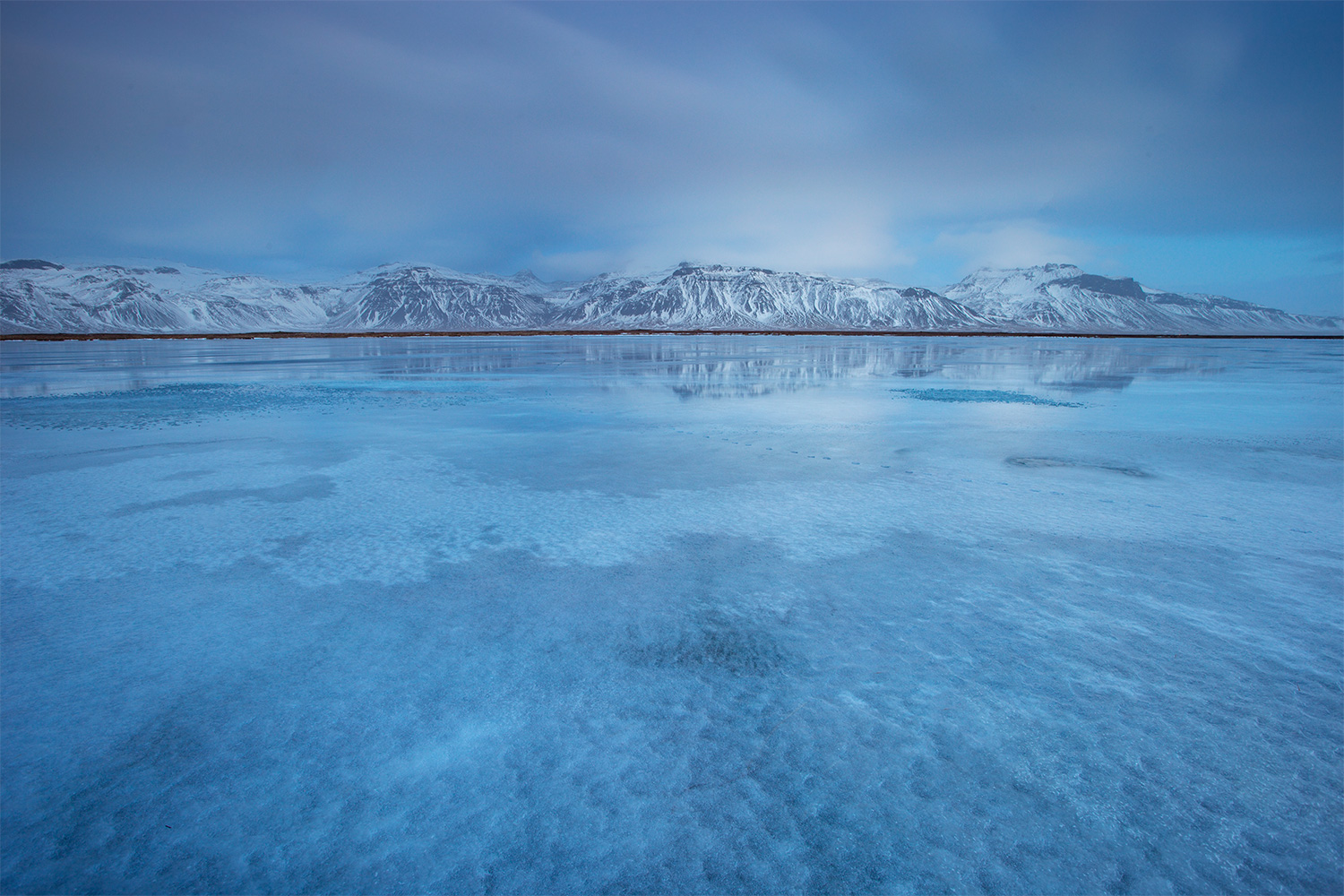Mi piace molto la composizione ad ampio respiro con i monti innevati in lontananza e i riflessi sotto appena accennati. L'interpretazione cromatica è molto decisa e sicuramente avrai avuto le tue ragioni per spingere così tanto il blu: personalmente lo avrei attenuato un po', ma è solo una mia opinione