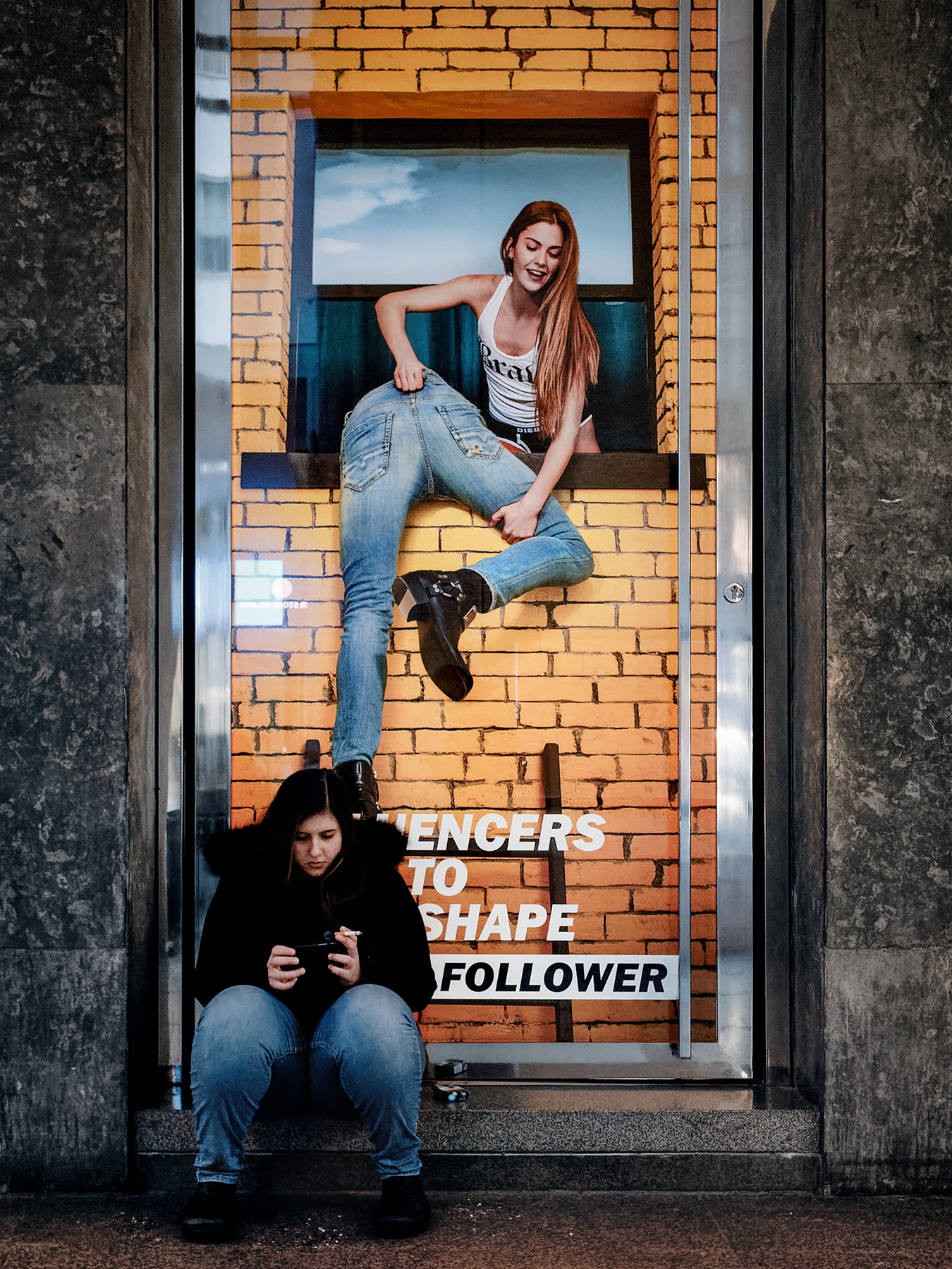 | Nel richiamo dell'abbigliamento (jeans) secondo me sta la forza di questa immagine, in cui la realtà si confonde con la pubblicità. La ragazza che attende il suo turno ai piedi del muro, ammazzando il tempo con lo smartphone.. |