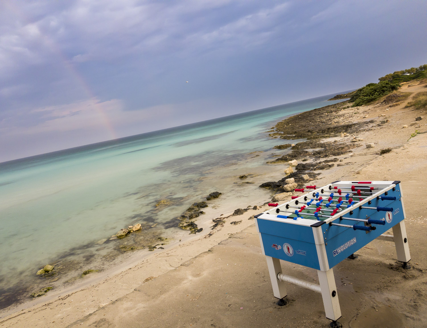 Andando indietro nella tua galleria, dopo le chiacchiere fatte qui mi ha colpito questa che per me contiene dei bellissimi elementi: su uno scenario di bel mare con un cielo delicatamente movimentato e sormontato da un tenue arcobaleno, un incongruente e colorato calcio balilla solitario sulla spiaggia. Alla buona resa dell'insieme contribuisce anche la ripresa da un punto rialzato.