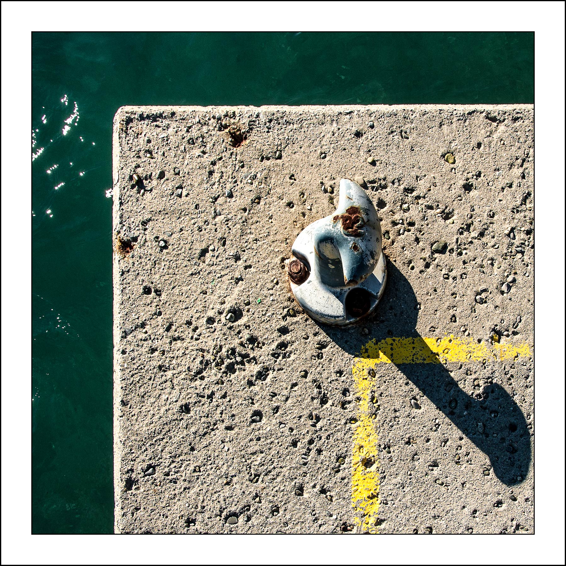 Quadrato...nel quadrato ,nel quadrato,nel quadrato ,compositivamente eccellente . Naturalmente io leggo nella lettera B ( del Bruno/Brad marinaio) la narrazione. Salda è la bitta che deve offrire sicuro ormeggio alle più disparate imbarcazioni .La sua ombra allungata verso il molo (in diagonale e trasversale!)è un vigoroso racconto di ormeggi e ormeggiatori da un lato mentre dall'altro spicca la porzione di mare ( perfetta gestione degli spazi del frame) tesa a dirci di attracchi o partenze, un insieme che dà voce al porto, sonora, concreta, reale e voce alla fantasia, alle testimonianze, ai ricordi ...la solidità di un 'fare' e di un dire fotografico che colpisce sempre.