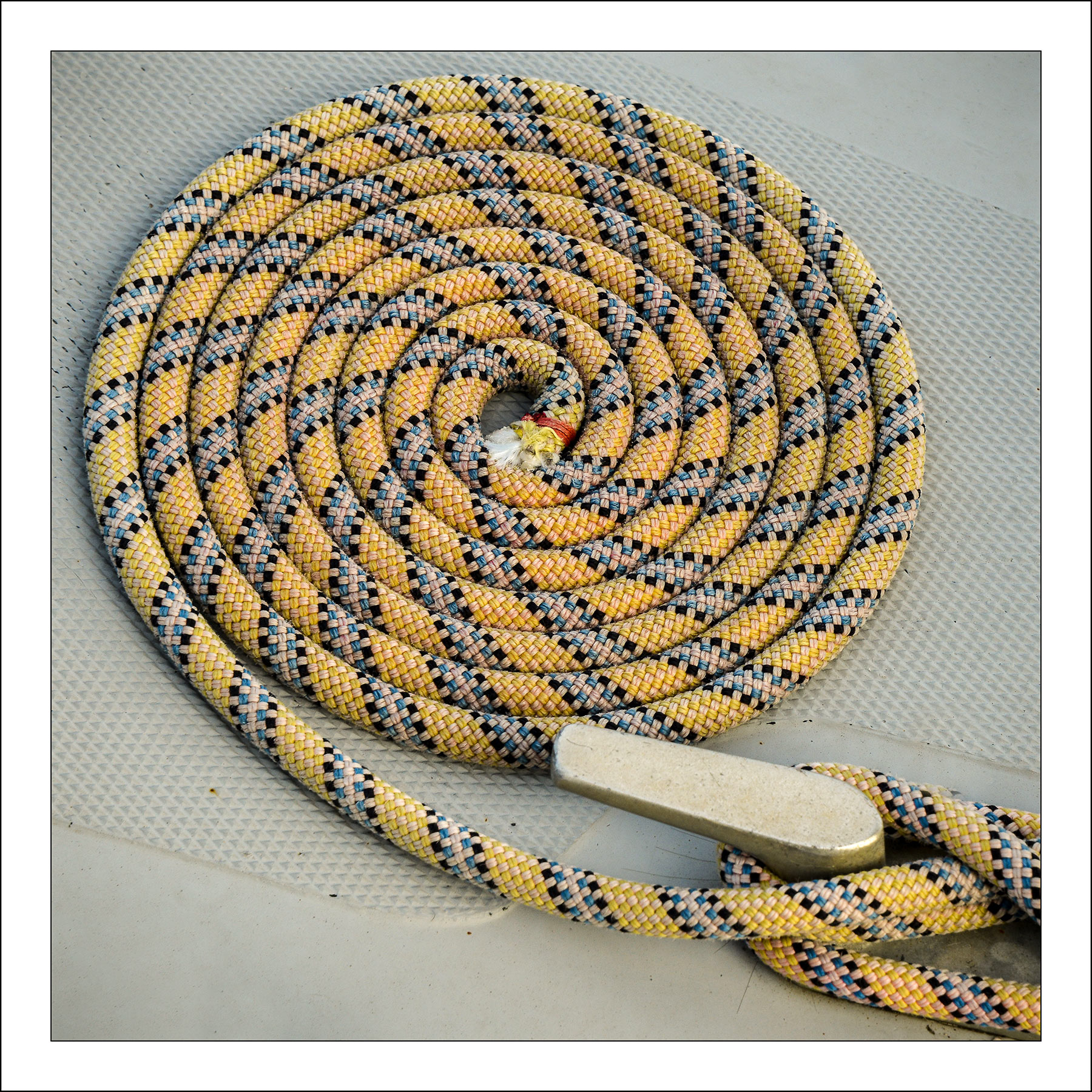 La foto : un parilato in cui tutto è ordine compositivo, geometrico oserei dire. Colore caldo rotto da un punto di rosso non casuale. Come non lo sono il verso della bitta e il disegno dell'intreccio delle fibre che richiama la zigrinatura antiscivolo. Il tutto confezionato in un'ottima nitidezza.