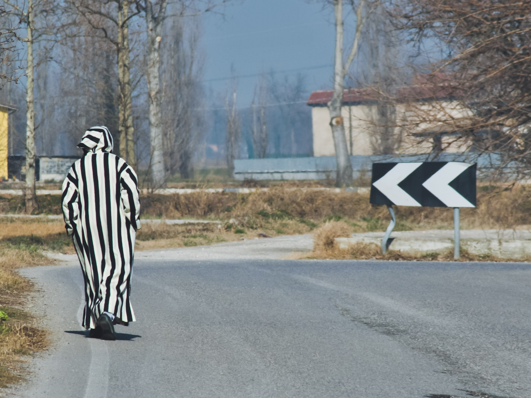 È vero che la qualità risente dell'aver travasato il file di qua e di là, ma il materiale fotografico c'è, con l'uomo che cammina sulla linea bianca a bordo strada, il segnale sulla destra che, "indicandolo", rimanda all'abito dell'uomo, una contestualizzazione ambientale utile a rendere l'atmosfera.